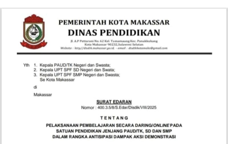 HALLOMAKASSAR.COM – Dinas Pendidikan Kota Makassar mengeluarkan surat edaran terkait pelaksanaan pembelajaran daring (online) untuk seluruh satuan pendidikan jenjang PAUD/TK, SD, dan SMP, baik negeri maupun swasta, mulai 1 hingga 4 September 2025.