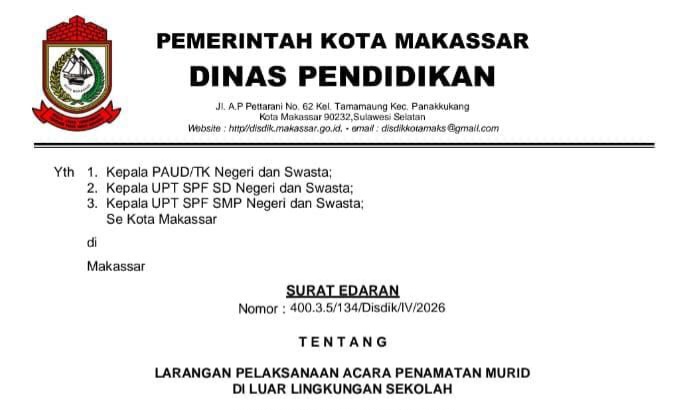 Kebijakan ini tertuang dalam Surat Edaran Nomor 400.3.5/134/Disdik/IV/2026 yang ditujukan kepada seluruh kepala PAUD/TK, SD, dan SMP negeri maupun swasta se-Kota Makassar.